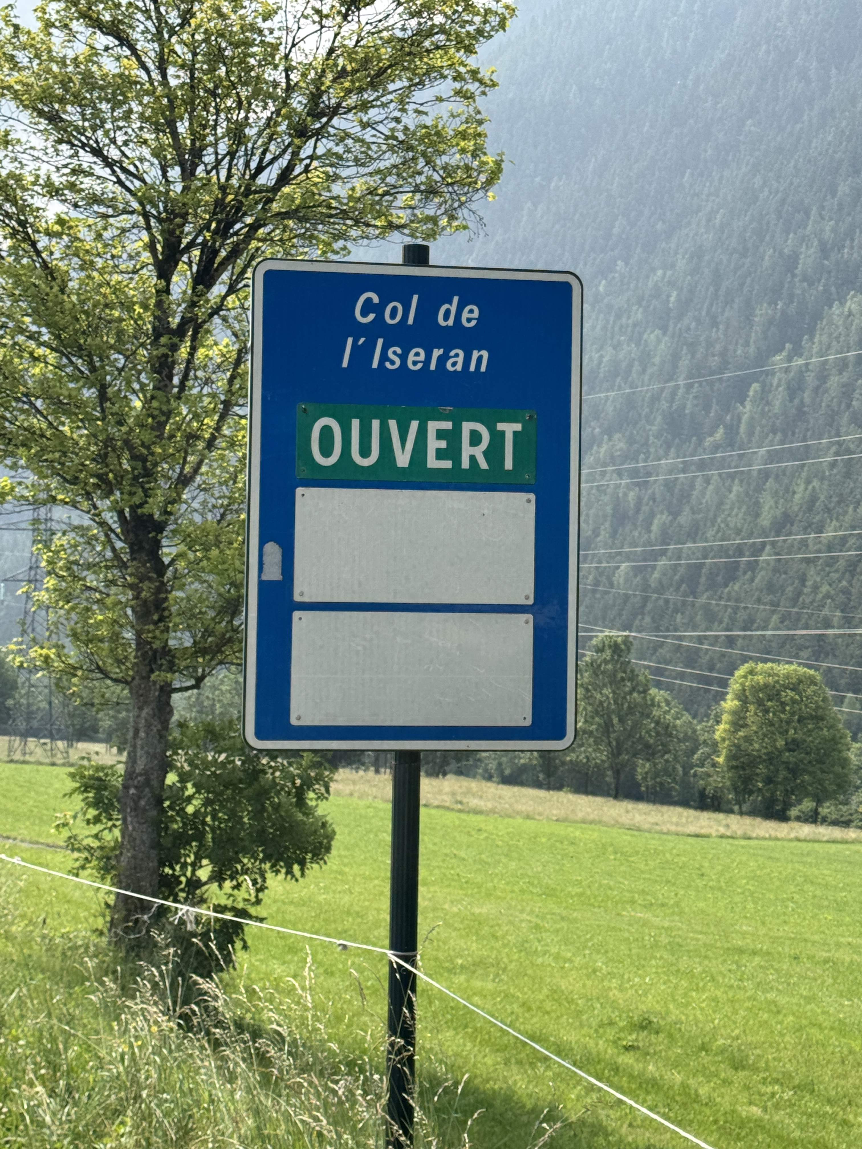 Hinunter geht’s am Motorradhotel Belvedere vorbei nach Seez. Und was sehen wir im Tal angekommen? Das für uns so erhoffte Schild „Col d’Iseran OUVERT“. Yess, es hat tatsächlich geklappt und der Iseran ist einen Tag vor unserer Ankunft geöffnet worden. Freudentänze auf dem Moped und ein Grinsen im Gesicht bis zum Hinterkopf! 😁