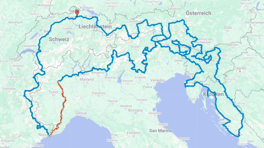 Wir sind heute früh um 8:00 Uhr in Menton gestartet. Zuerst führte uns der Weg durch das Hinterland von Ligurien. Dass wir nun von Frankreich kommend, die Grenze nach Italien passieren, mussten wir gar nicht erst an einem Strassenschild ablesen. Allein die Beschaffenheit der Strassen ist ein Zeichen dafür, dass wir uns nun wieder in Italien befinden. Das einzige, was diese Strassen im Hinterland zusammenhält, sind die vielen Schlaglöcher.