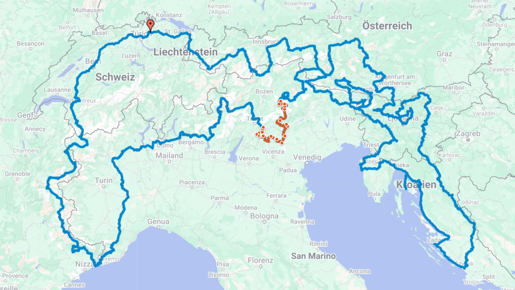 Gestern war offiziell Ruhetag – inoffiziell haben wir ihn mit einer kleinen Spritztour von nur 3,5 Stunden gefüllt. Klar, bei dem Wetter muss man ja fast fahren! Unsere „Mini-Runde“ führte über die Kaiserjägerstraße, Passo del Cost, Sommo, Coe, Forcella Valbona und die doppelte Portion Vena di Sopra & Sotto. Danach gings zurück ins Hotel in Levico Terme – fast erholt. 😅