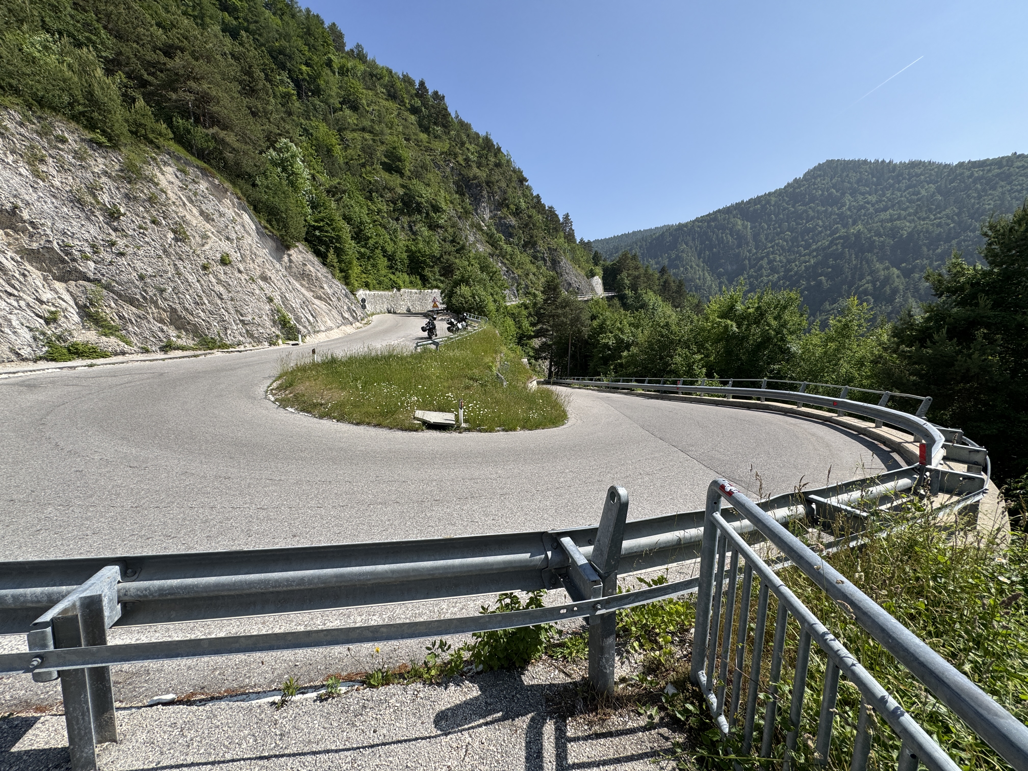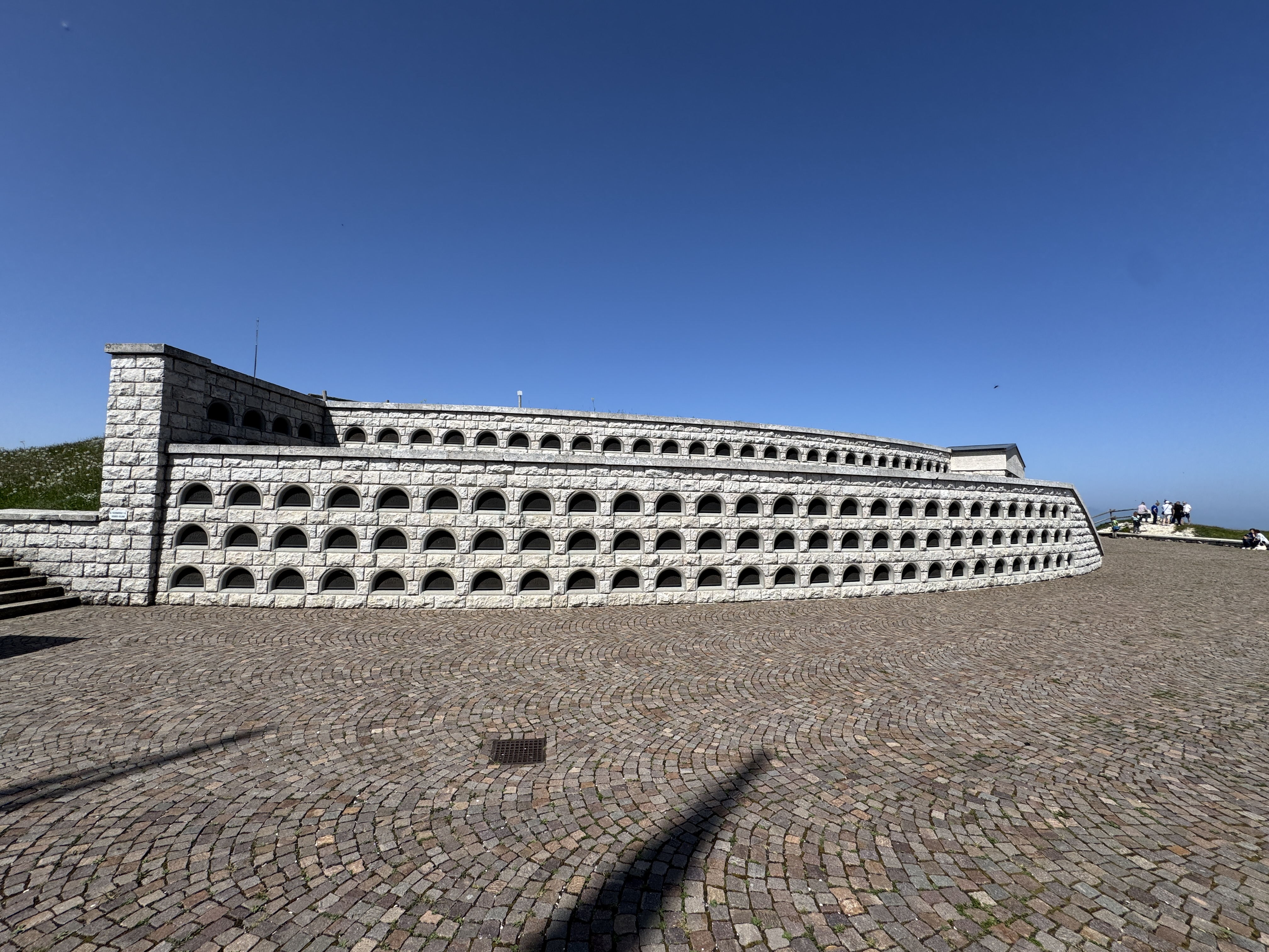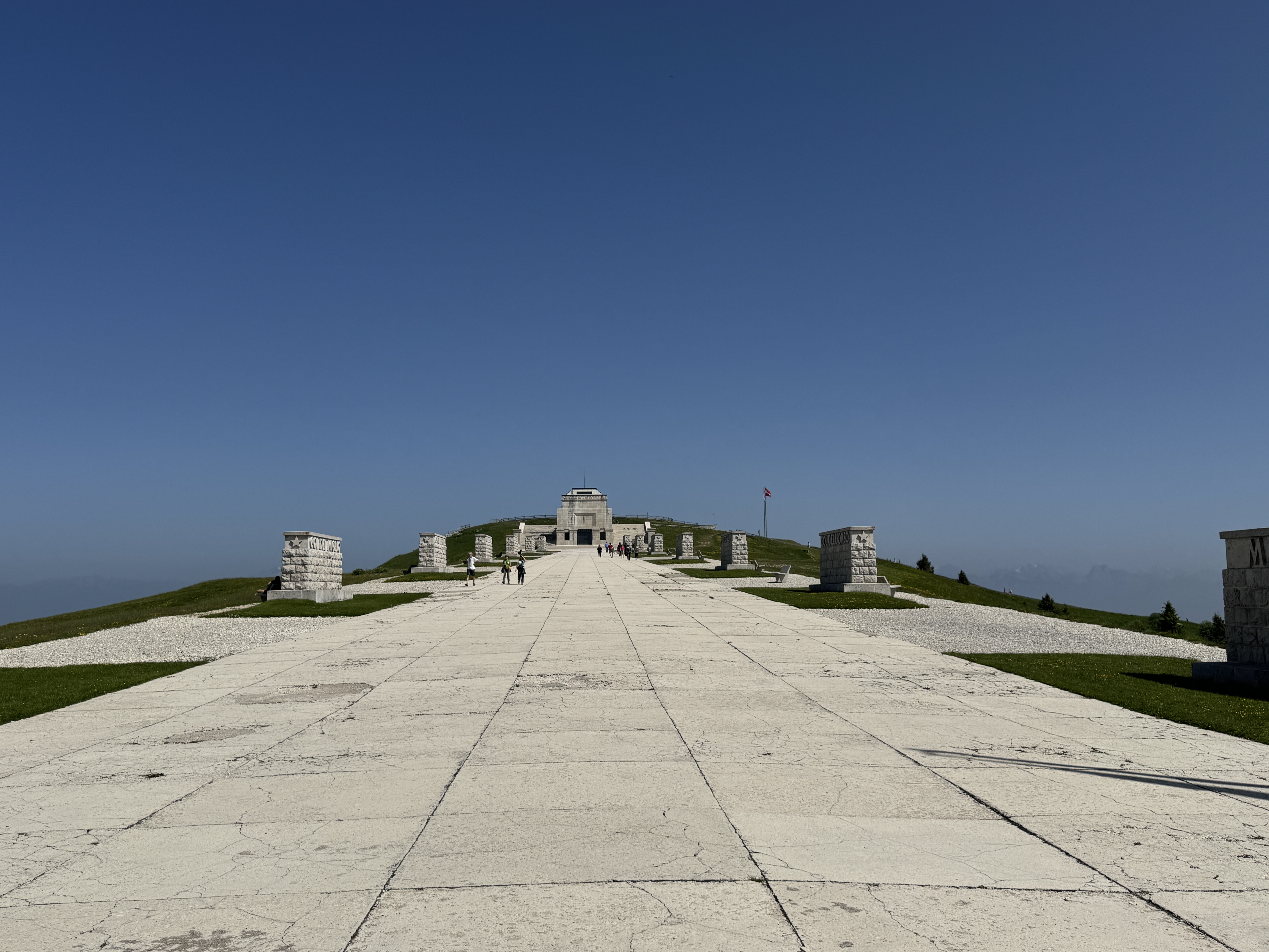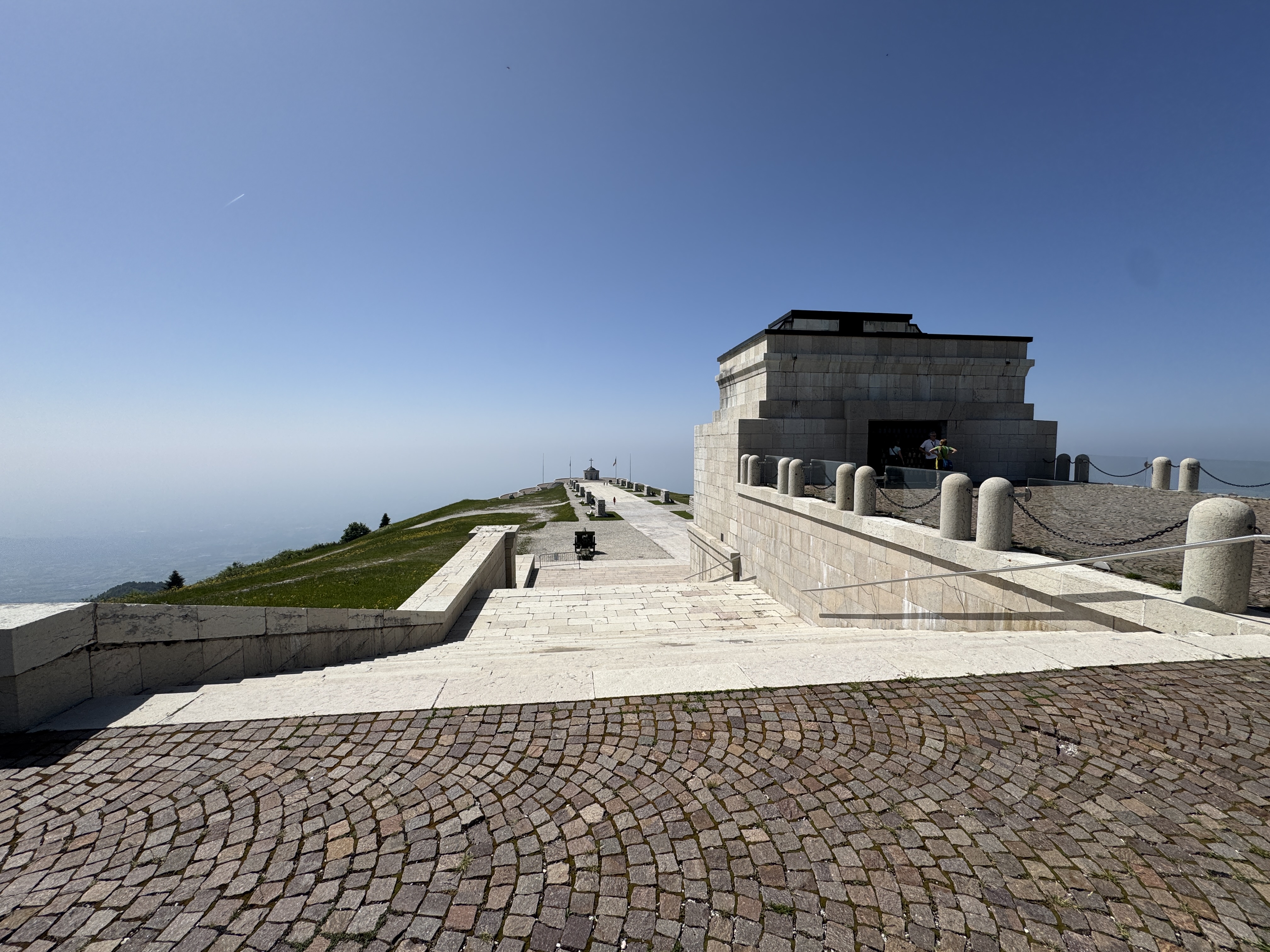 Heute früh ging’s wieder über die Kaiserjägerstraße, dann über den Passo Stretto Richtung Bassano del Grappa – sehr charmant mit Stadtmauer und historischen Häuschen. Und dann ab zum Grappa! Also… Monte Grappa. Kein Schnaps, sondern ein Berg mit ordentlich Geschichte und einem riesigen Weltkriegsdenkmal. Die meisten sind direkt nach oben gefahren. Marion hat sich dann aber hinter mir – gut getrennt durch zwei Viehtransporter – entschlossen 10 Minuten vor dem Gipfel eine andere Richtung einzuschlagen. Die fünf Herren auf ihren Motorrädern hinter hier dachten natürlich, dass dieser Tour Guide die Strecke genau kennt und fuhren ihr blind hinterher. Kurze Zeit später merkten alle ihren Irrtum und kehrten um und machten sich dann doch noch auf den Weg zu mir also Richtung Gipfel 😂