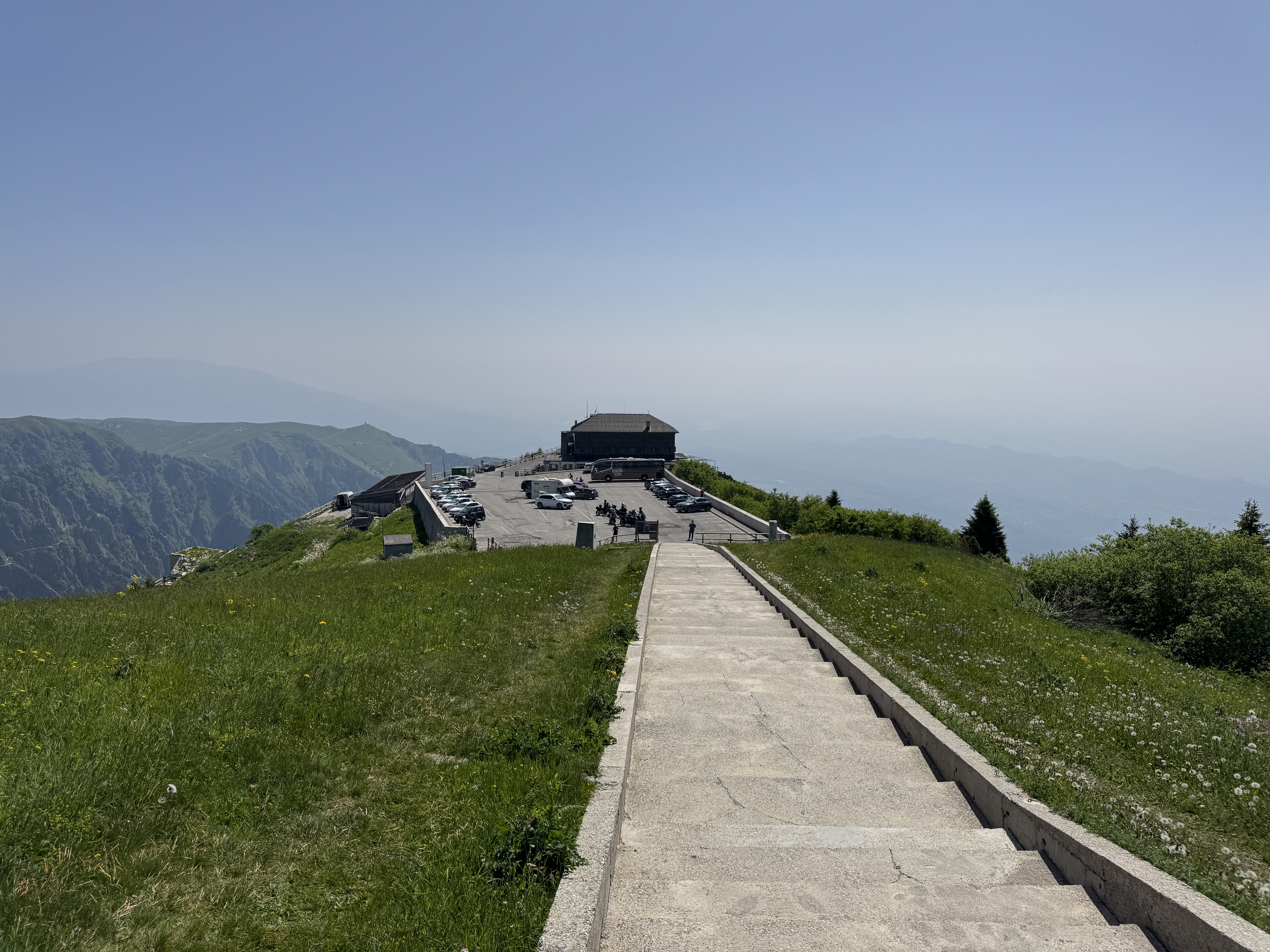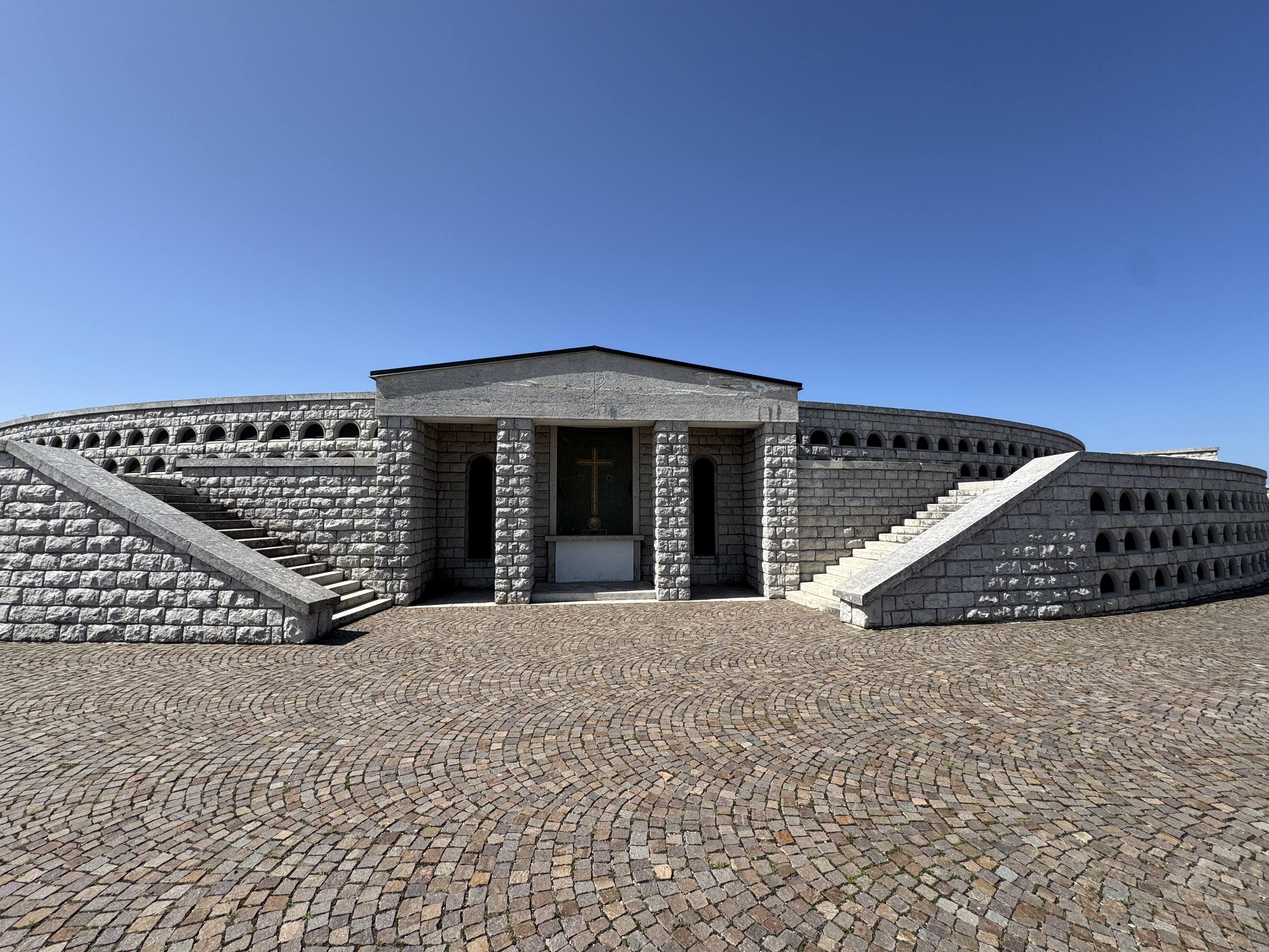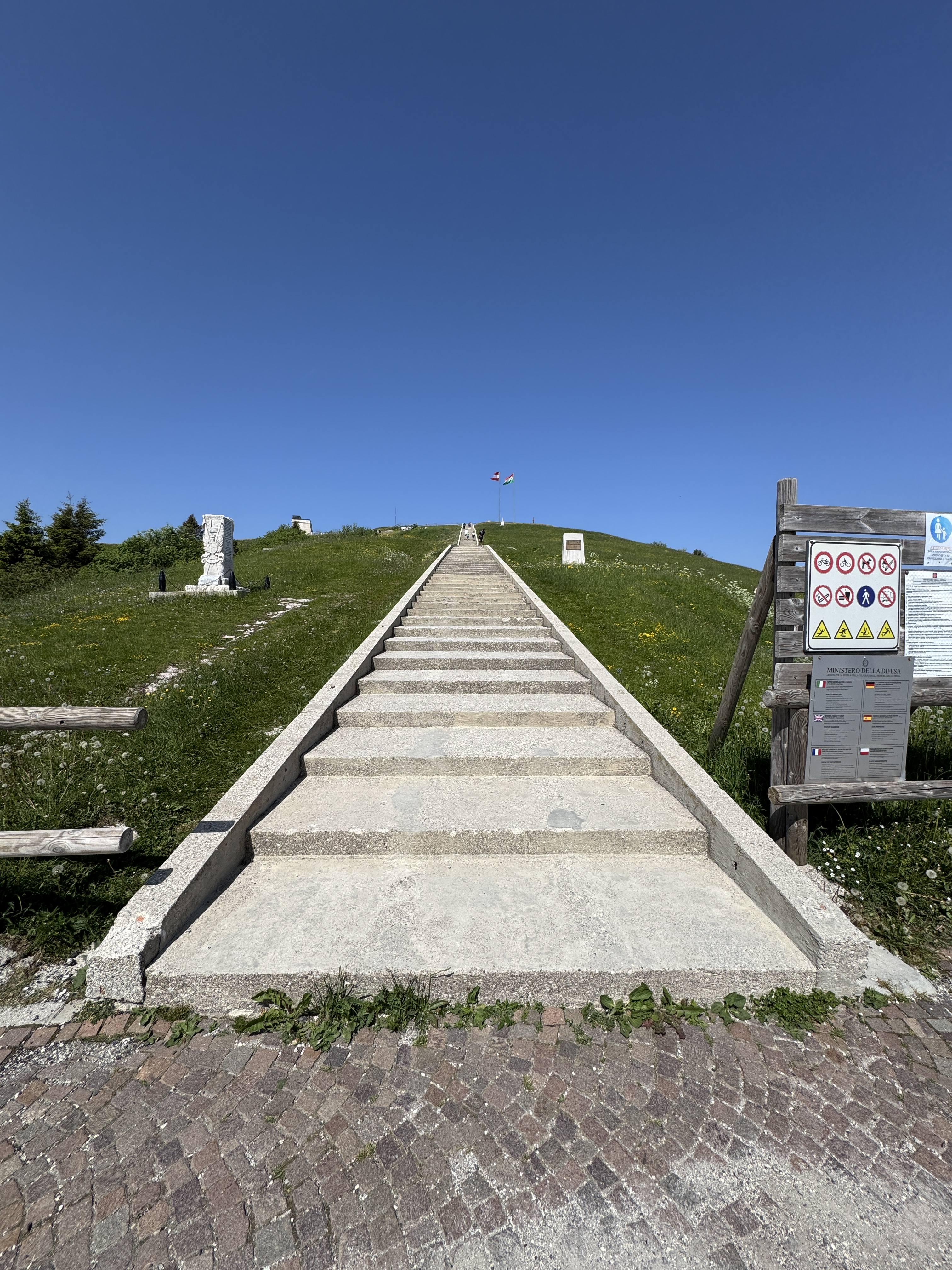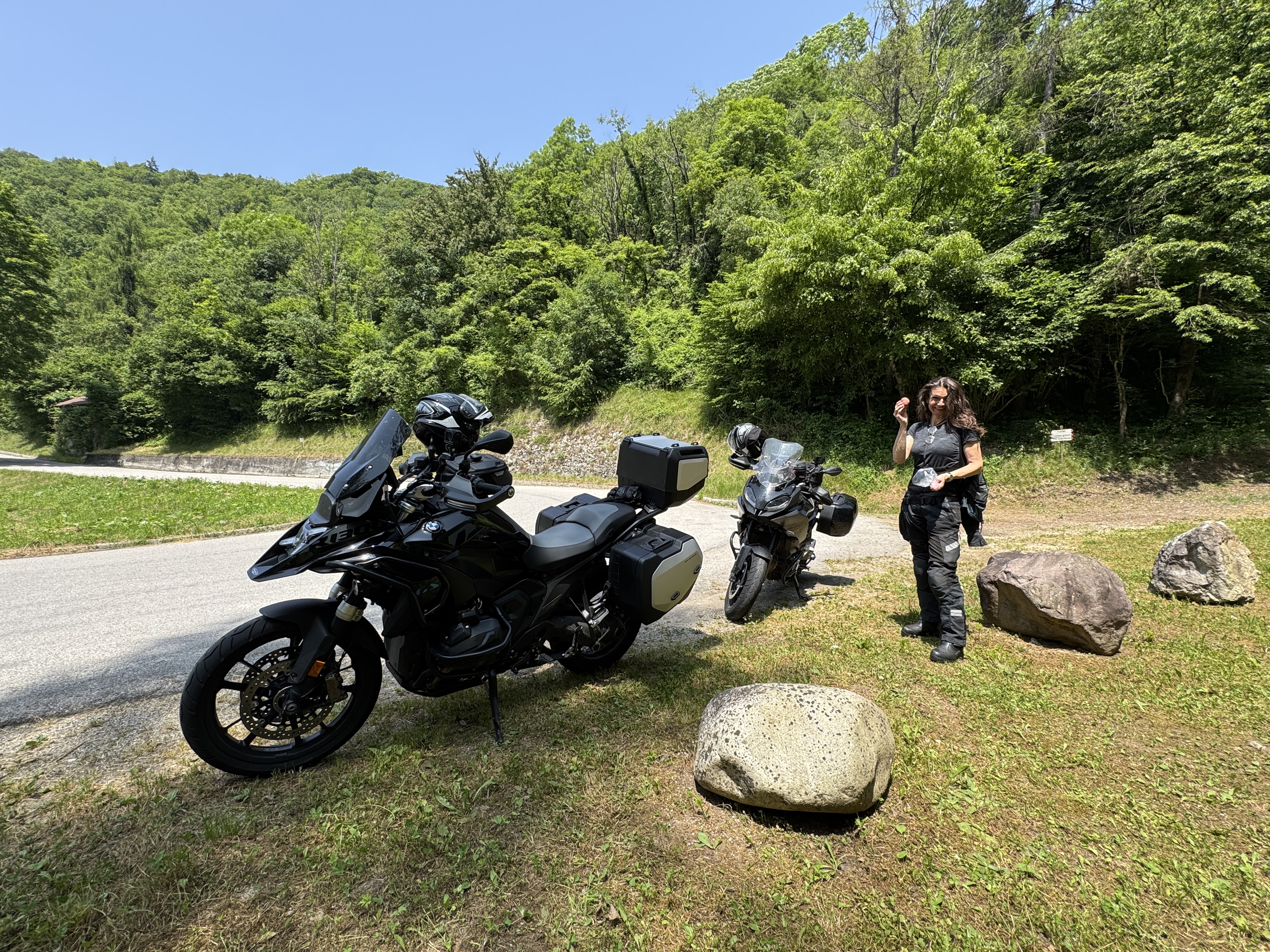 Heute früh ging’s wieder über die Kaiserjägerstraße, dann über den Passo Stretto Richtung Bassano del Grappa – sehr charmant mit Stadtmauer und historischen Häuschen. Und dann ab zum Grappa! Also… Monte Grappa. Kein Schnaps, sondern ein Berg mit ordentlich Geschichte und einem riesigen Weltkriegsdenkmal. Die meisten sind direkt nach oben gefahren. Marion hat sich dann aber hinter mir – gut getrennt durch zwei Viehtransporter – entschlossen 10 Minuten vor dem Gipfel eine andere Richtung einzuschlagen. Die fünf Herren auf ihren Motorrädern hinter hier dachten natürlich, dass dieser Tour Guide die Strecke genau kennt und fuhren ihr blind hinterher. Kurze Zeit später merkten alle ihren Irrtum und kehrten um und machten sich dann doch noch auf den Weg zu mir also Richtung Gipfel 😂