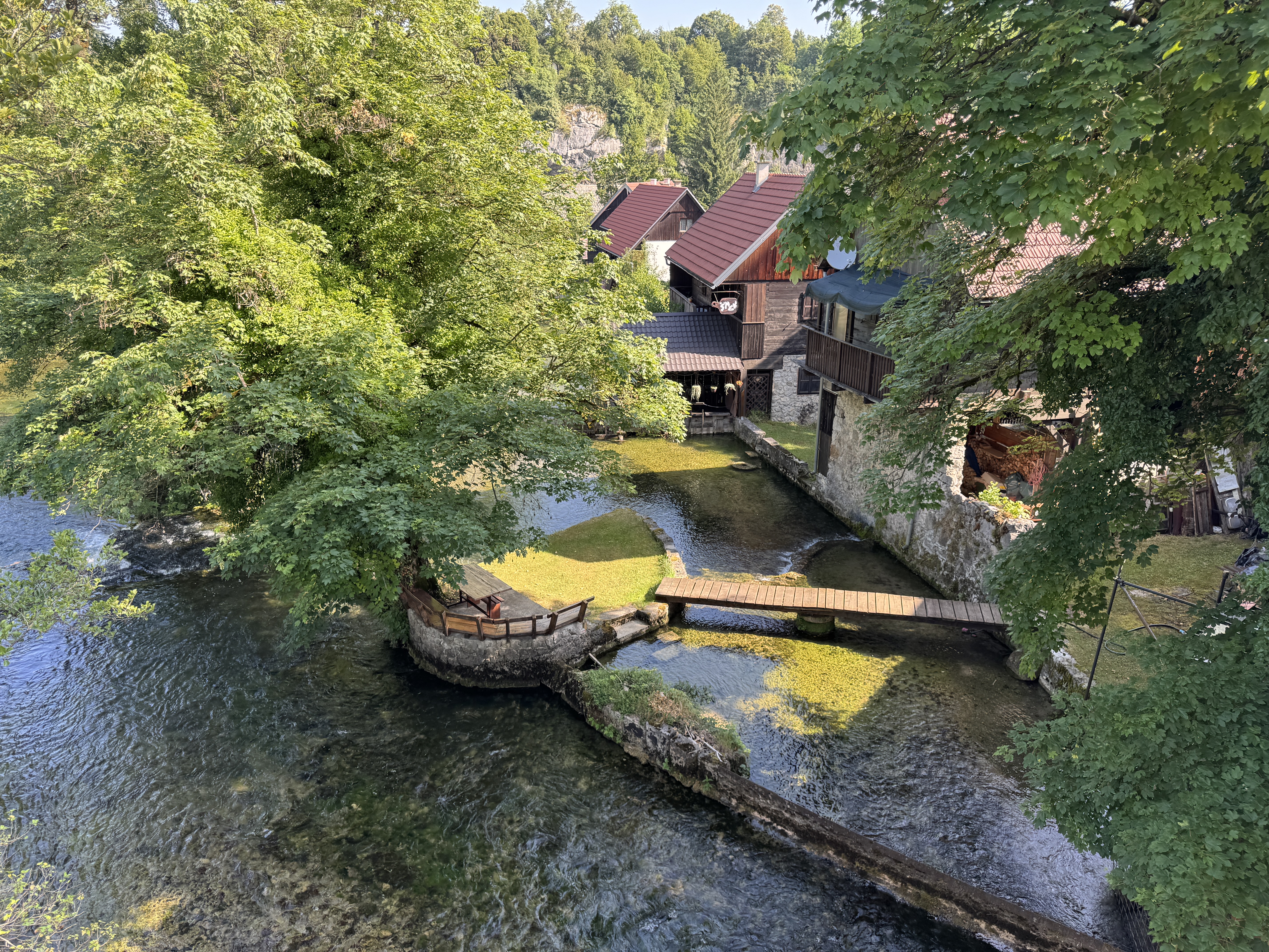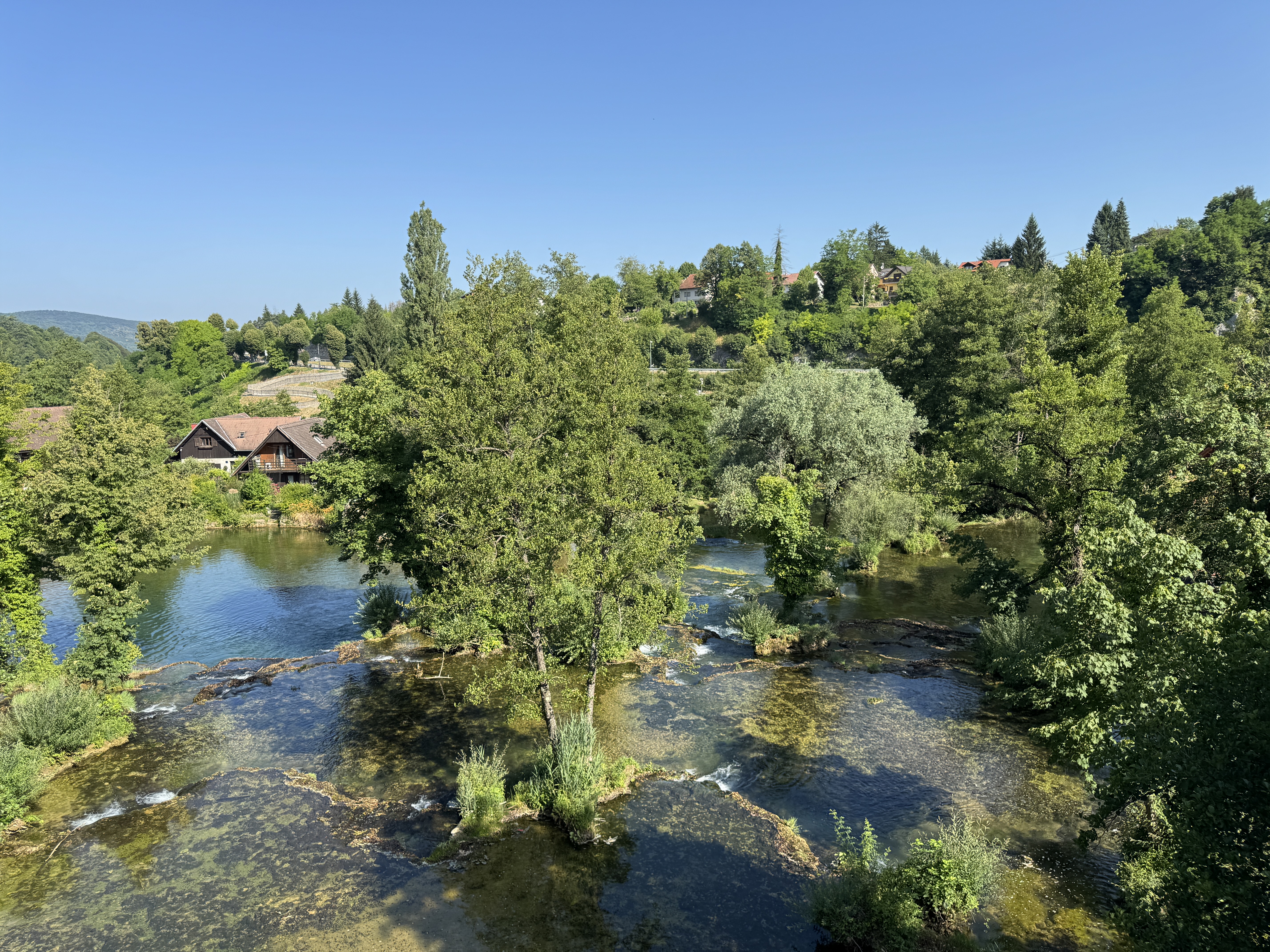 Vorbei am Wassermühlendorf Rastoke geht’s stetig bergauf zum Javorski Pil. 32° im Kombi – Sauna auf Rädern.