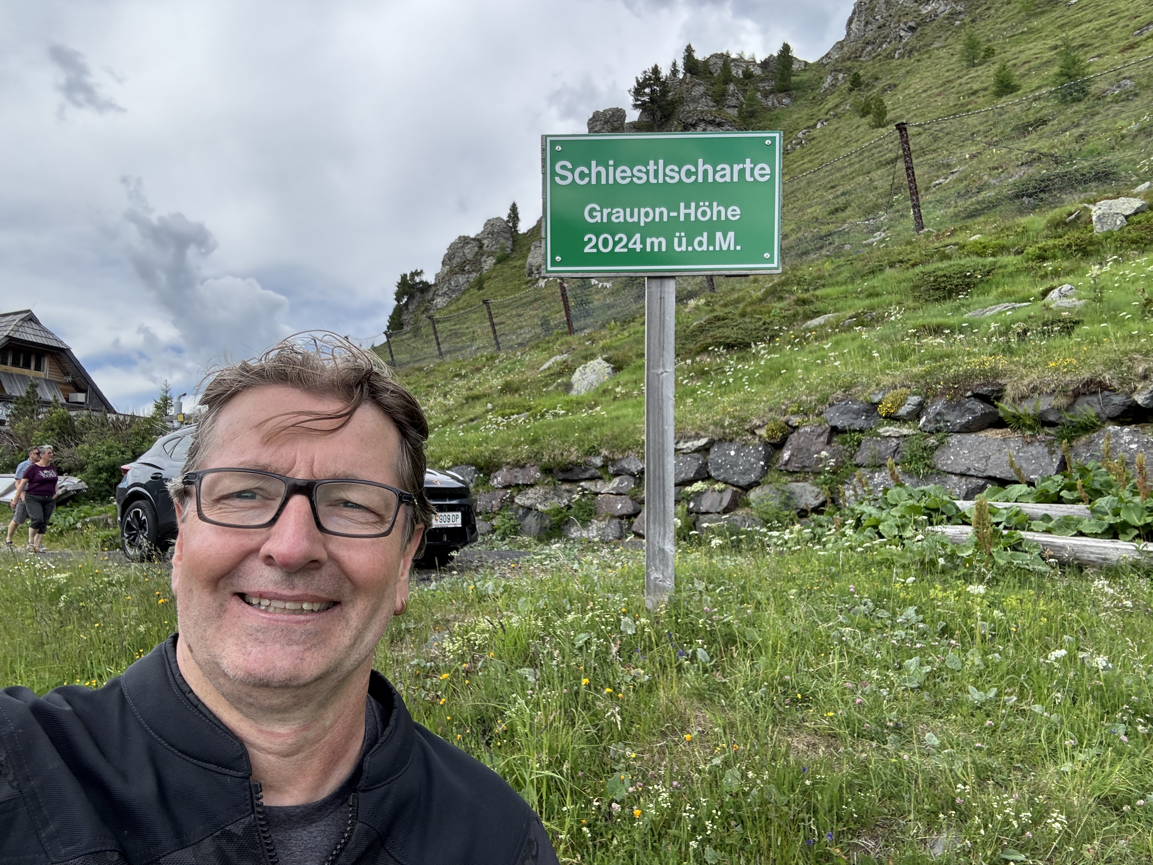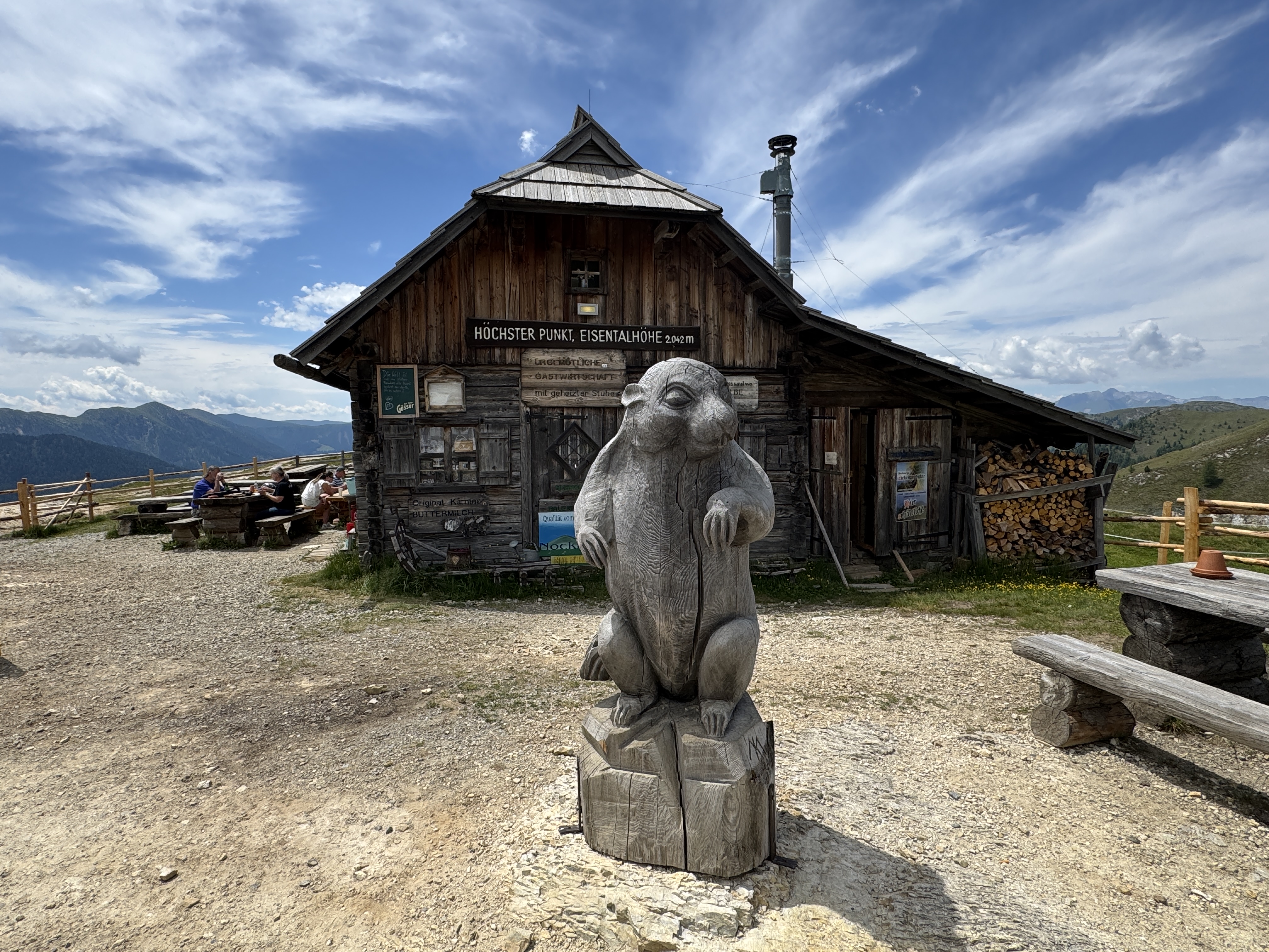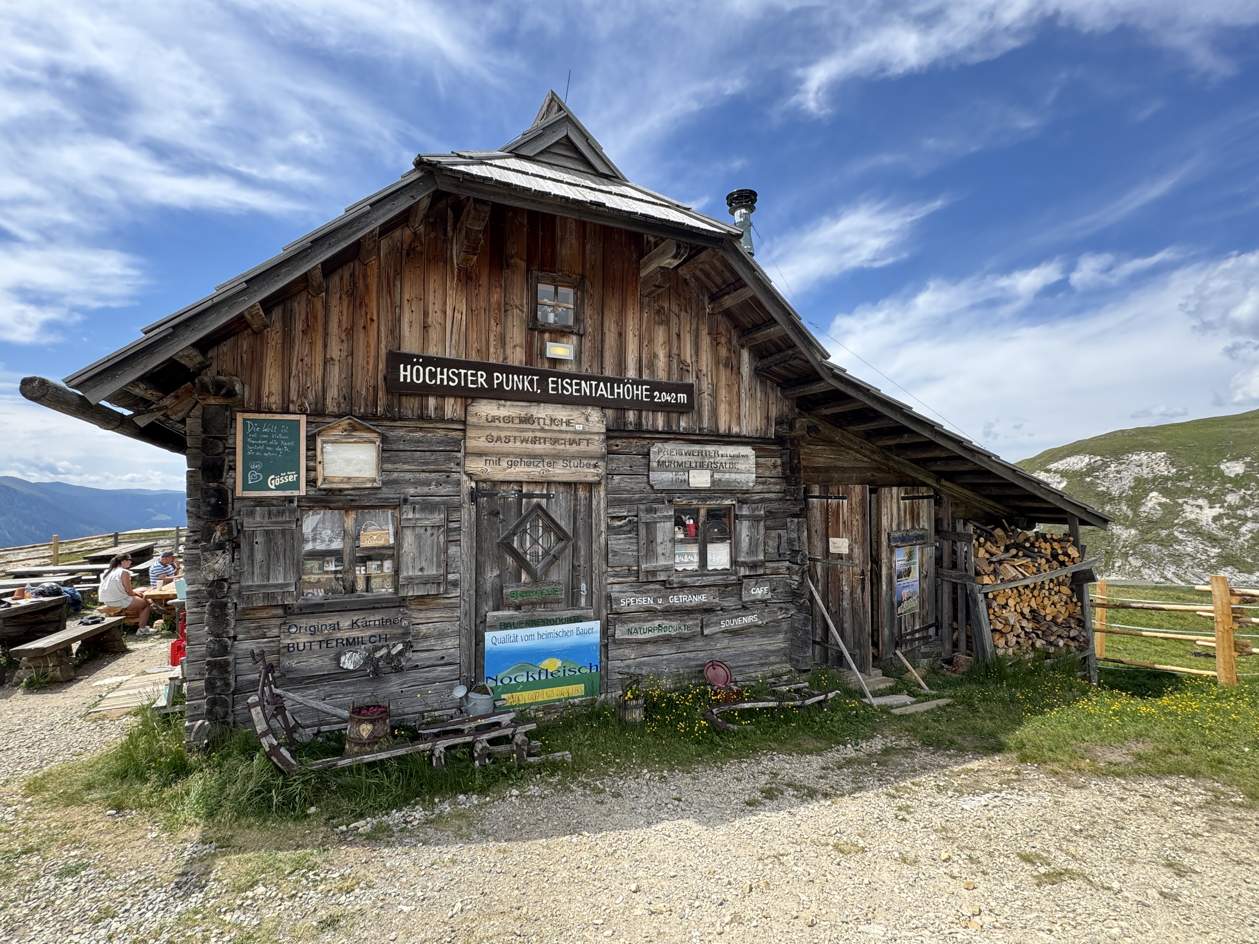 Kurzer Stopp an der Schiestlscharte, dann weiter zur Jausenstation Eisentalhöhe. Pro-Tipp: Das ist der höchste Punkt auf der Nockalm, nicht die bekanntere Schiestlscharte – wieder was gelernt! Dort gönnten wir uns in der Sonne eine zünftige Jause und einen Plausch mit dem Wirt, der den Laden schon ewig schmeisst.