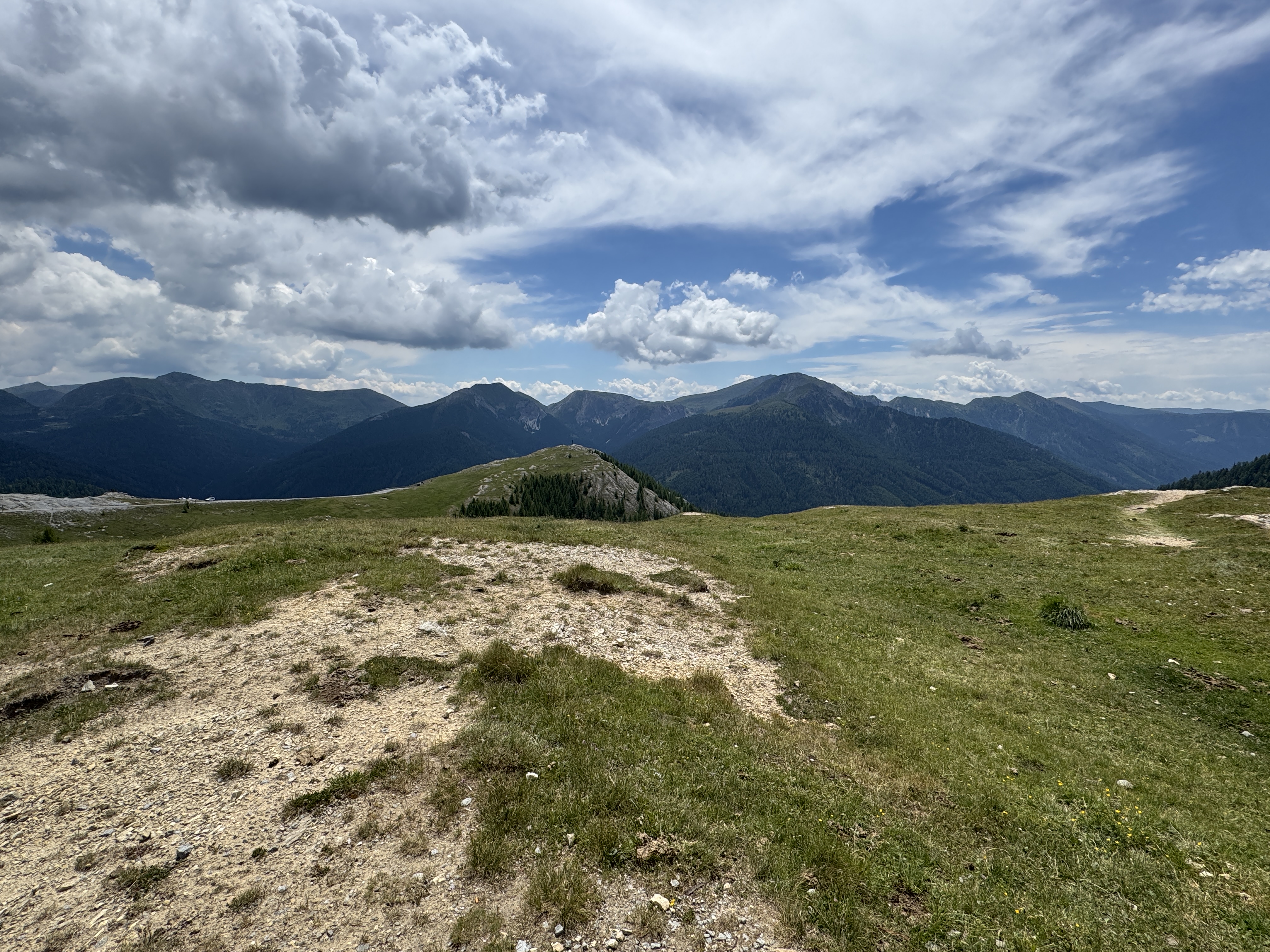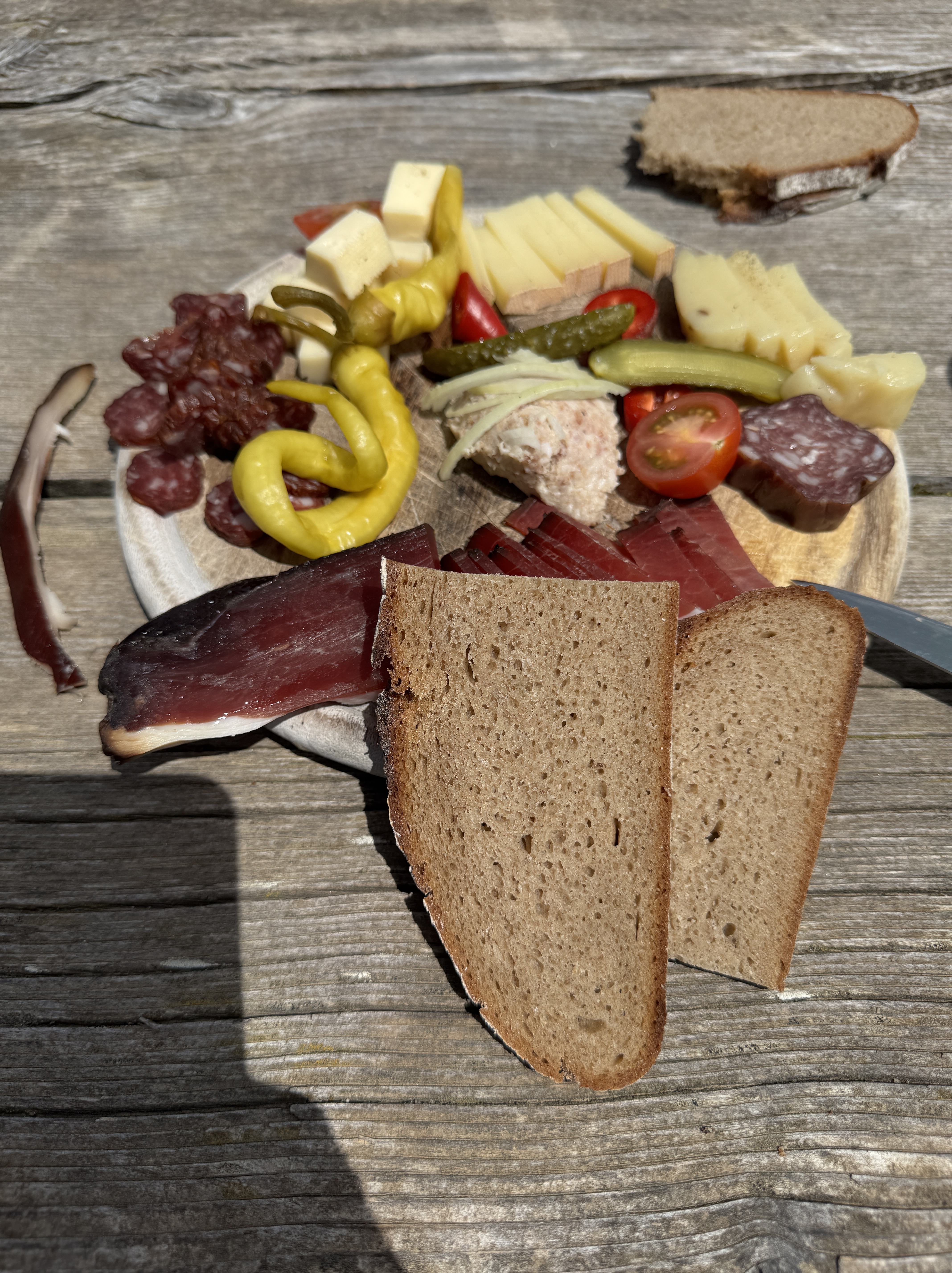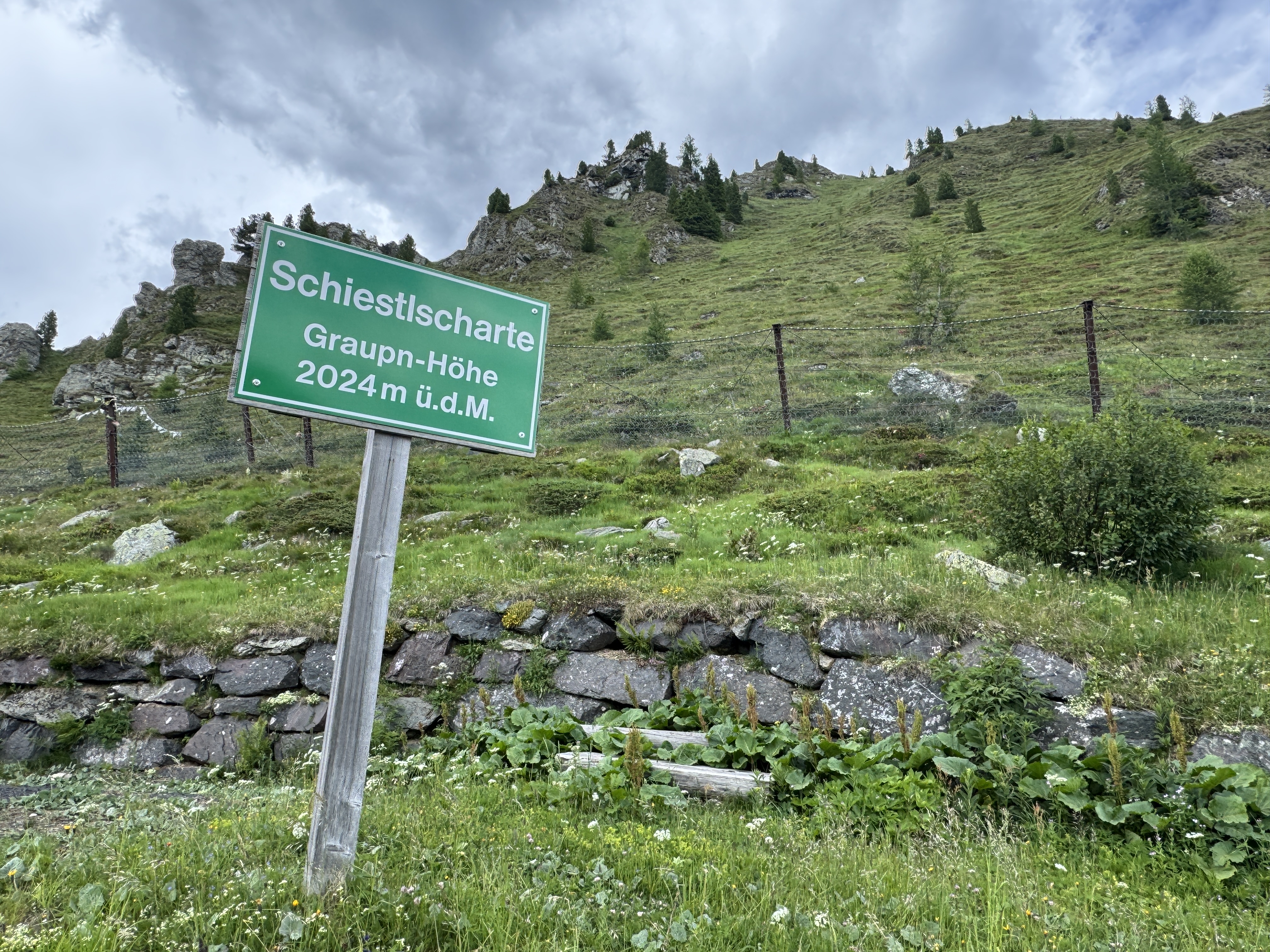 Kurzer Stopp an der Schiestlscharte, dann weiter zur Jausenstation Eisentalhöhe. Pro-Tipp: Das ist der höchste Punkt auf der Nockalm, nicht die bekanntere Schiestlscharte – wieder was gelernt! Dort gönnten wir uns in der Sonne eine zünftige Jause und einen Plausch mit dem Wirt, der den Laden schon ewig schmeisst.